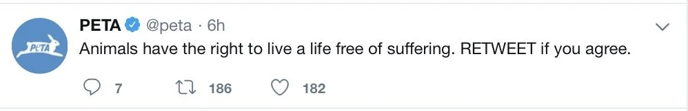 Screenshot of a tweet from PETA reading “Animals have the right to live a live free of suffering. RETWEET if you agree.”